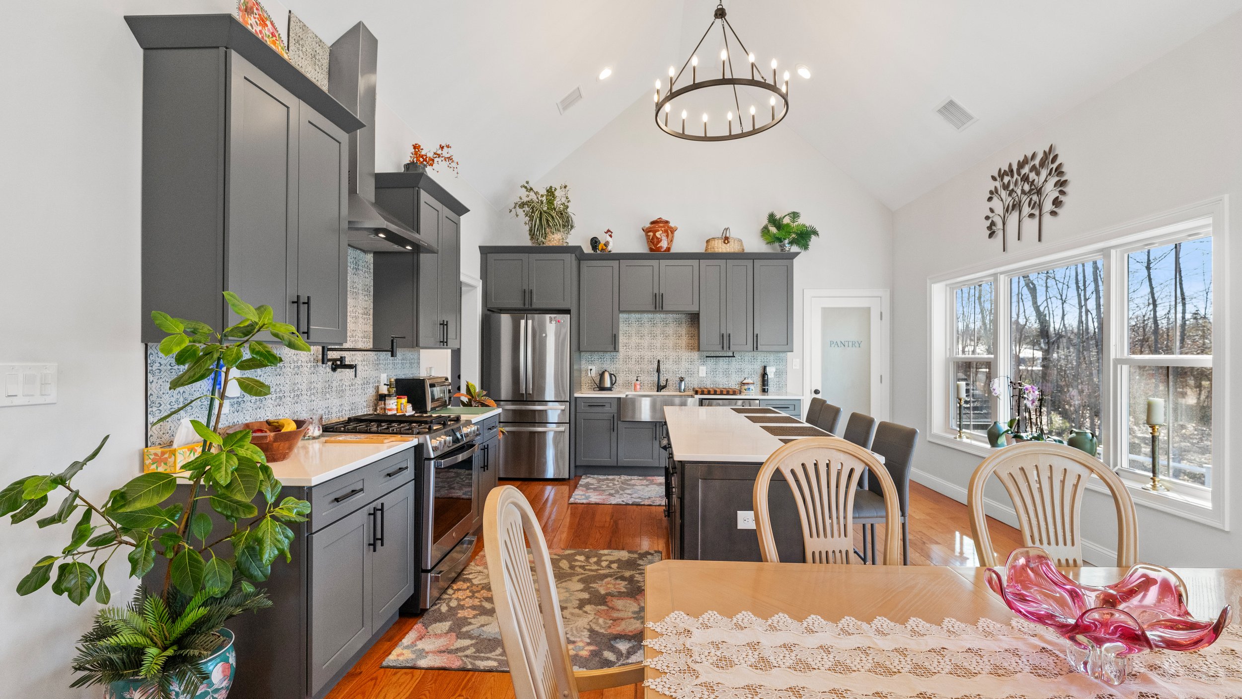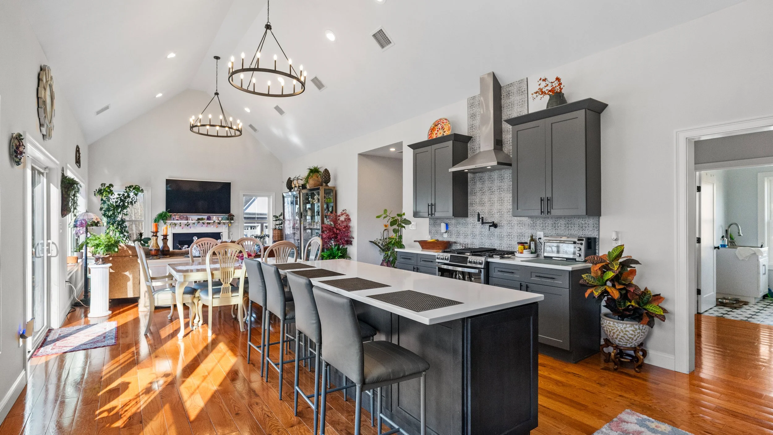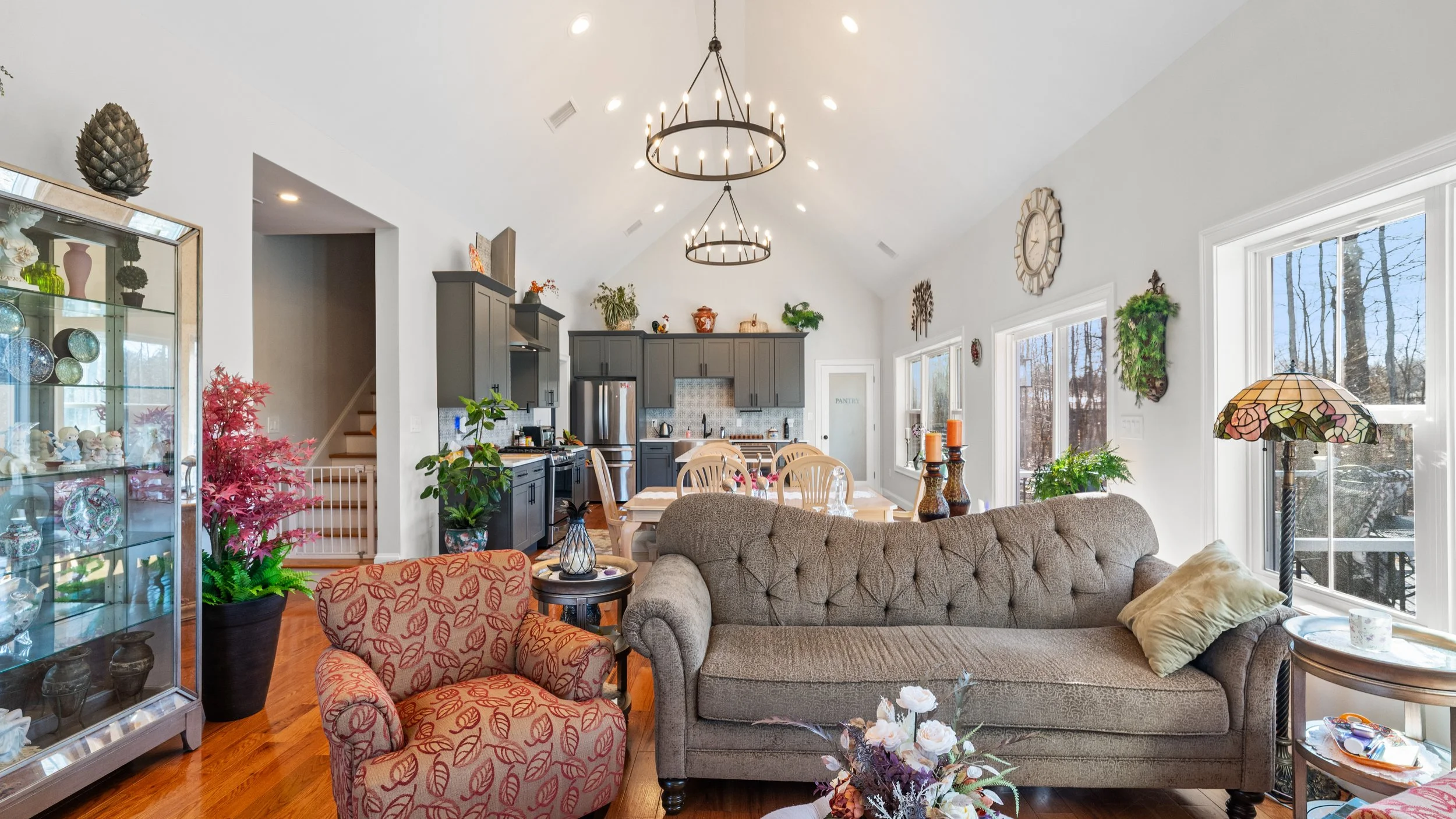 Cathedral ceilings create a bright, welcoming atmosphere in the main living areas.